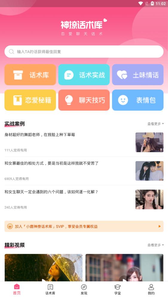 1. 丰富的聊天题材和技巧:该应用程序提供了丰富的聊天题材和技巧,从打招呼、引荐、调侃等各种方面出发,帮助用户快速掌握聊天技能。2. 多种评价及反馈机制:在聊天之后,用户可以对聊天话术进行评价,如赞、踩等,对话术进行排序。通过该应用程序的反馈机制,用户可以快速提高聊天技巧,进而提高自己的社交能力。