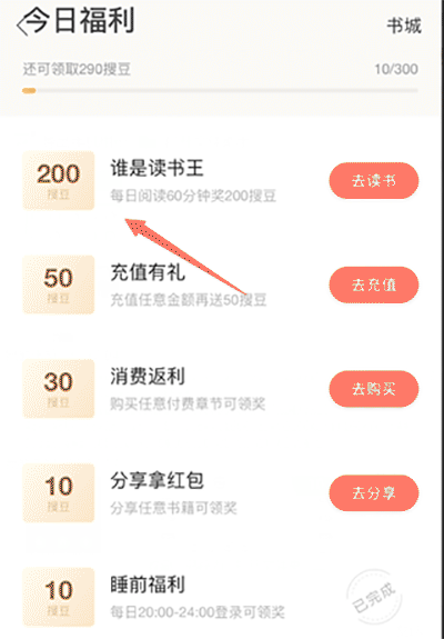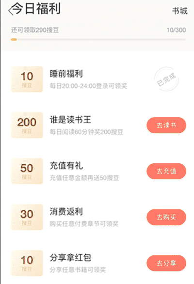 4、可以看到,每天通过完成任务,*多可获取300搜豆,在20点至24点之间进行登陆可以完成“睡前福利“任务获取10搜豆。