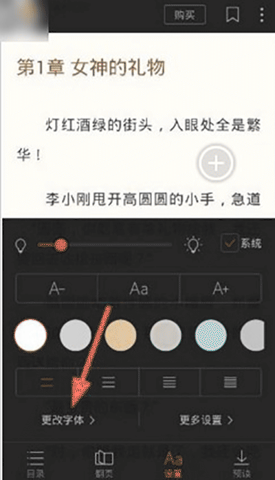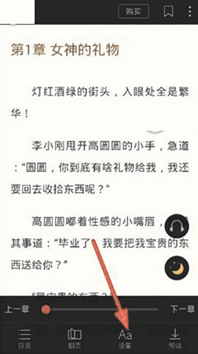 1、用户在阅读界面点击屏幕中间,然后点击“设置”
