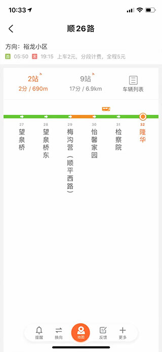 动态换乘:去哪儿?结合公交动态信息、首末班发车信息及路径距离等多维度的精准换乘方案实时地图:地图显示公交车的走向及该线路上所有公交车当前位置