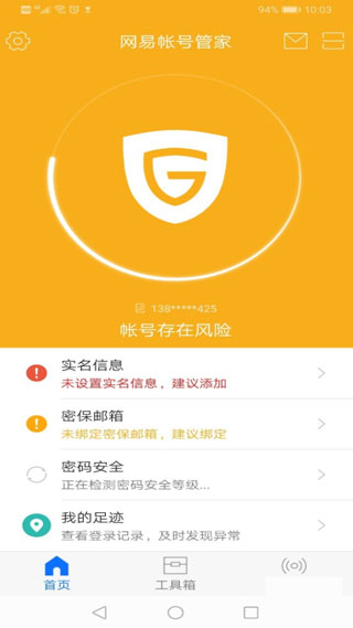 3、一般首次登入管家中心,就会检测一下帐号的安全性,如下图所示: