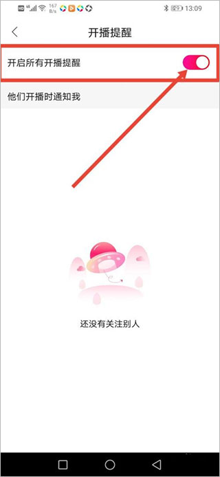 5、进入开播提醒页面,然后把【开启所有开播提醒】的按钮关闭即可。