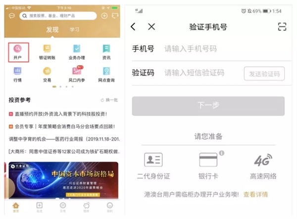 1、兴业证券app首页:开户,验证手机号填写手机号页面,客户点击“发送验证码”获取短信验证码(请确保手机网络环境良好)。