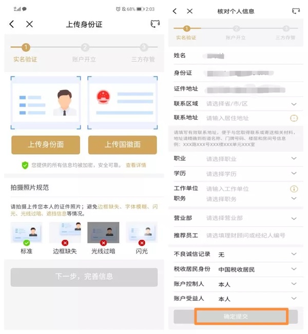 接下来,需要根据提示,上传身份证照片,填写个人信息并进行核实。