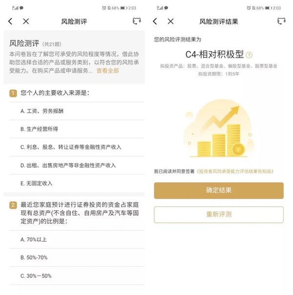 下一步,需要做一份风险测评,它会用来判断你的风险承受能力,共21题,结合自身真实情况回答。