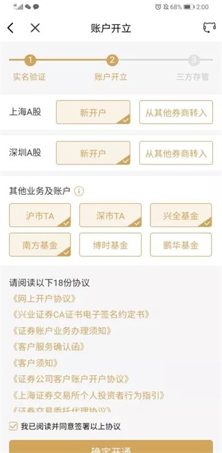 接着,选择需要开通的证券账户功能,为了能开通上海、深圳两大证券交易所的交易权限,一定要记得选择“上海A股”“深圳A股”新开户,方便以后进行交易。如若选择【转户】需提前到原券商办理撤销指令和转委托。