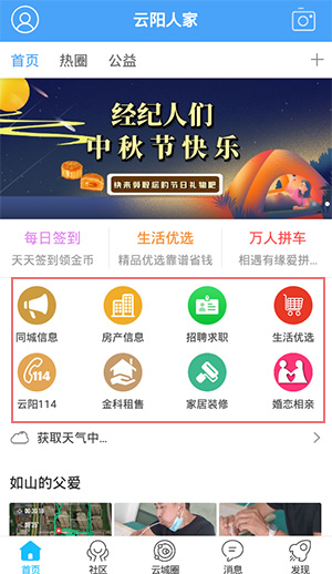 1、在本站下载安装云阳人家app,在手机上运行软件,可以看到有首页、社区、云城圈、消息、发现五个板块;2、在首页,可以看到有同城信息、房产信息、招聘求职、生活优选等;