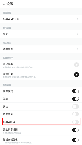 同样在设置界面,找到snow水印一栏,将其后面的开关关闭即可。