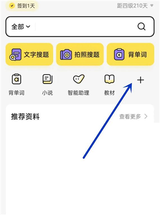 打开不挂科软件,页面进入学习界面。点击右上角背单词下面的加号图标,如图。
