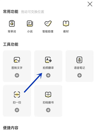 在工具界面点击进入拍照翻译即可进行拍照翻译。