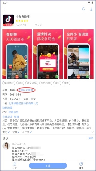 3、在历史版本页面可以看到抖音极速版的所有版本,选择点击“下载”你想要的那一个版本就行了