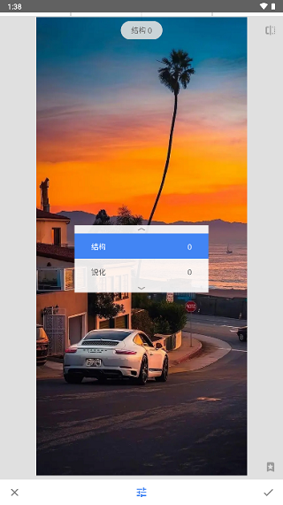 突出细节:细节选项就是对图片进行细节处理,让主体更突出。跟调整图片一样,上下滑动选择选项,左右调整数值。结构就是增加图片中的细节,突出显示照片中对象的纹理且不影响边缘。锐化就是增加图片细节的锐度。