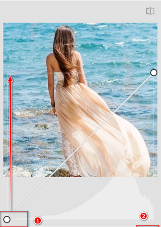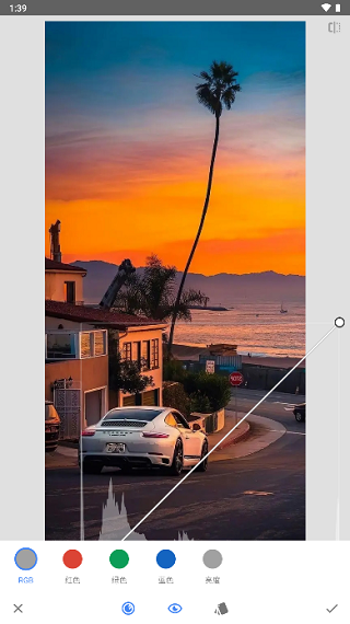 ② RGB曲线:点击底部最左侧菜单,即可看到5条曲线选择的按钮,首先就是RGB曲线,它主要的作用是提亮或压暗画面曝光,提升或降低画面的对比度。可以针对画面全局进行调整,也可以分别针对画面的暗部、中间亮部和亮部进行调整。如果要提升或者压暗整体画面的曝光,只需在曲线的中间打1个锚点,再按住锚点往左上角拉动即可提升整体画面曝光,往右下角拉动,则整体曝光降低。