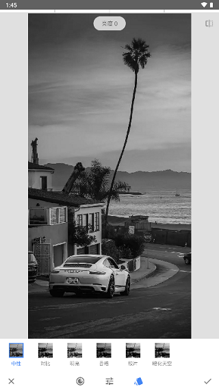 黑白:黑白滤镜能够让照片一键由彩色变为黑白色调,而且有多种黑白色调风格可以选择,对比、明亮、昏暗、胶片等多种风格,能够对亮度、对比度、粒度单独进行调整,是把彩色照片调整为黑白照片的一个最快最直接的方式。