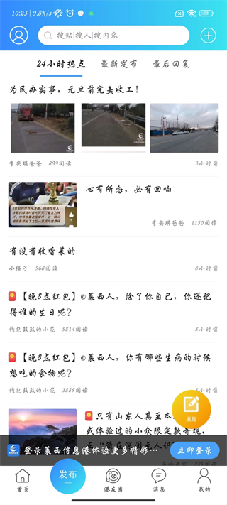 2、点击“莱西社区”,可以查看网友最新发布的帖子,也可以右边黄色圆圈自己发帖参与讨论。