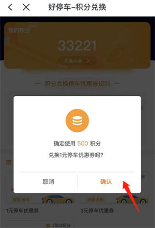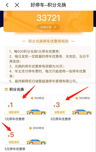 3、根据积分情况选择1元、3元、5元停车券进行兑换。