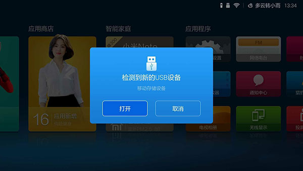 2、将U盘插到盒子的USB接口上面,检测到新的USB设备并打开,如果没有弹出对话框,选择【高清播放器】,找到【移动存储设备】
