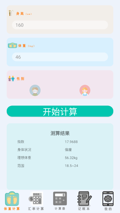 你可以输入自己的身高、体重和性别,点击计算后,就可以在下方查看你的BMI数据。
