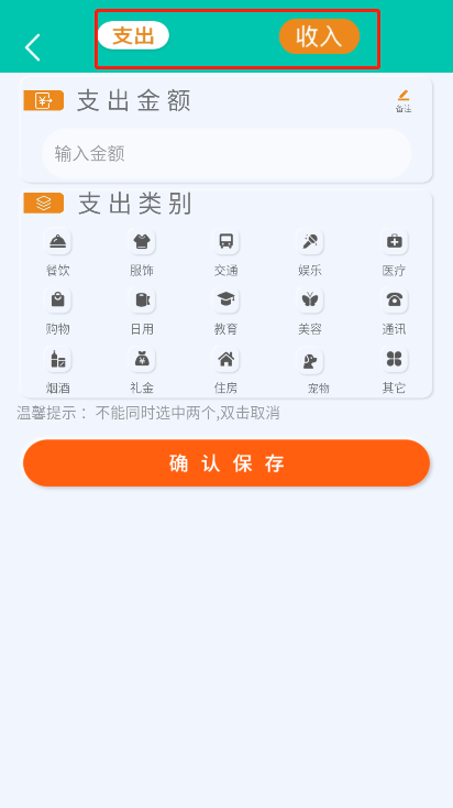 还提供了生活中常用的记账本,用户可以在这里添加收入或者支出的账单,保存好之后,就可以查询你的账单信息。