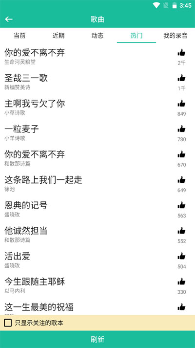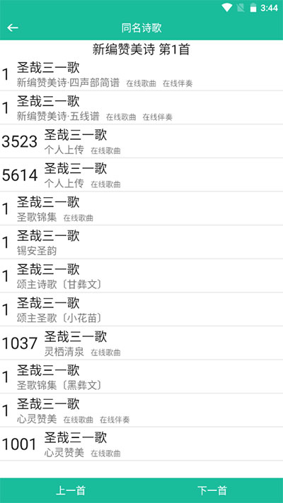 新编赞美诗,补充本,新编赞美短歌, 雅歌,赞美诗歌1218, 赞美诗选编1050, 赞美诗增订本,选本诗歌,选本诗歌附录版,选本诗歌712,780,805,选本之二,整编本,福音诗歌,圣徒诗歌,圣徒短歌,恩泉佳音,恩泉佳音续一,续二,续三,迦南诗选,天韵之声,赞美诗歌743,颂主圣诗,儿童天地,赞美之泉,王子音乐,小草诗歌,小羊诗歌,泥土音乐,敬拜赞美,赞美诗歌1384,1300,1608,1717,灵歌集,灵歌赞,经文诗歌,诗篇全集,和散那诗篇,属天的赞美,赞美歌声,赞美歌声二,大家歌唱,生命的绽放,旷野人声,灵音诗歌,心灵之声,教会诗声,草原圣诗,闽南圣诗,赞美耶稣诗集Vol1,真源诗集。
