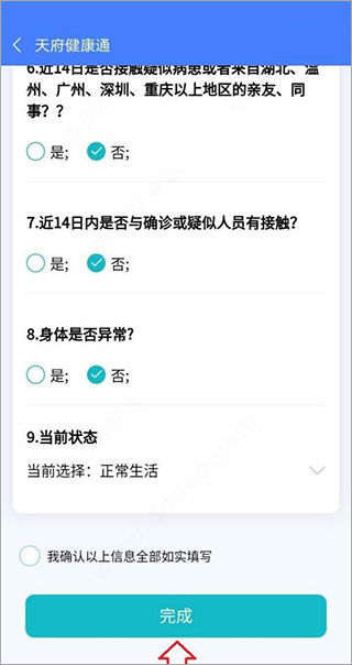 5、下滑,输入您的最近行程路迹,确认信息填写无误,点击【完成】。
