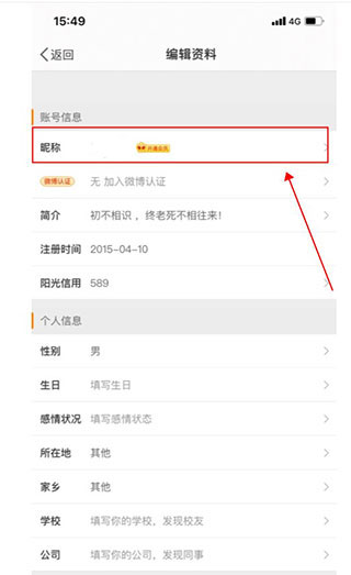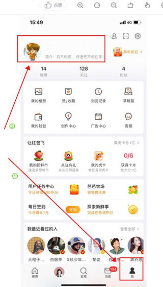 1、下载微博app,登录微博后,点击右下角的“我的”,然后点击上方的头像边上的文字简介,如下图所示。
