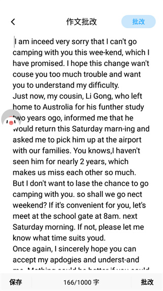 作文批改——用户可以通过拍照、键盘或者复制粘贴这三种方式输入英文文案。点击“批改”选项,系统会用特殊颜色的字体自动标识出错误的地方并提出修改意见。错误主要包括格式、拼写和语法这三类,根据每类错误出现的次数,系统会分别给出各单项和总体的条级、星级评价,点击“我的作文”还可以随时查询批改历史,牢记自己之前出现的错误。传统的人工批改作为费时费力,而百度翻译的作文批改功能可以让你不费吹灰之力就能实现自我纠错,英语学习的效率大幅提升。