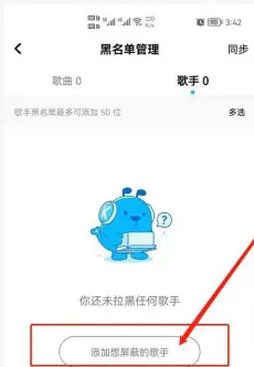 在弹出“黑名单管理”界面,选择下方“添加想屏蔽的歌手”就可以了。