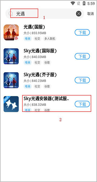 2、在上面搜索“光遇”,下面就会出现各种渠道服,用户就可以下载测试服啦