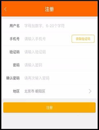 3、用户在注册界面中,输入【用户名】【手机号】【验证码】【密码】,选择【地区】之后,点击【注册】按钮,成功注册账号。
