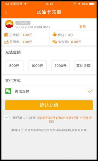 2、客户可以随时通过APP进行加油卡充值,并可通过微信支付。