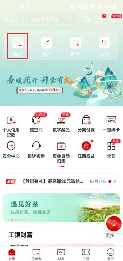 1、最开始肯定得先登录自己的手机银行账号,然后点击账户。