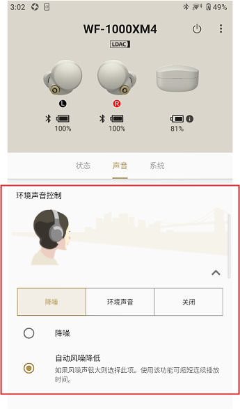 您可以在风噪声很大时选择“自动风噪降低模式”,耳机会检测并抑制风噪。