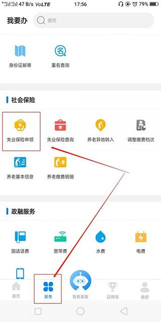 第一步,进入APP后点击下方菜单栏的“服务”—“失业保险”申领;