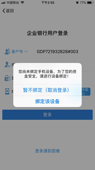 3、系统校验该客户识别号及操作员代码未绑定该设备时,弹出提 示框是否绑定该设备。