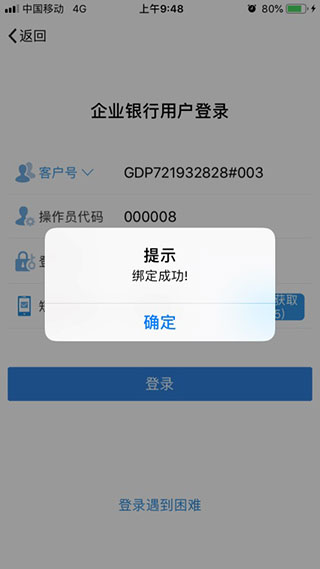 4、点击“绑定该设备”后,提示“绑定成功!”,再点击“确定” 即登录成功。