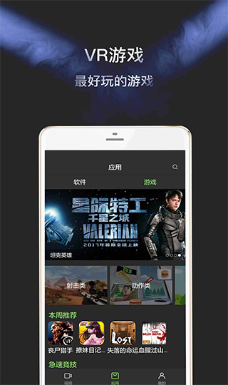 VR枪战射击、VR动作冒险、VR益智解谜、VR竞速跑酷、VR休闲娱乐等一系列惊险刺激的游戏等你来战。