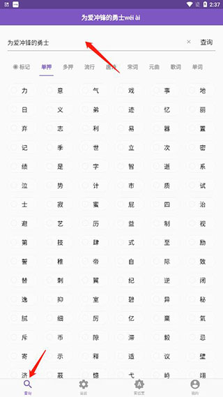 1、下载打开押韵助手app安卓版,在输入框中输入文字,点击查询;