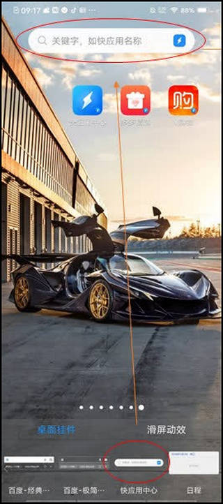 长按屏幕空白区域出现桌面挂件选择--左右滑动选择快应用挂件添加--点击快应用挂件搜索框打开快应用中心搜索页面。