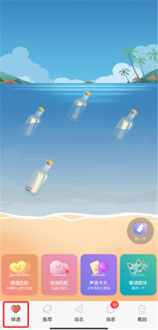 1、探遇页面:可以捞到别人的漂流瓶,也可以扔出自己的漂流瓶;