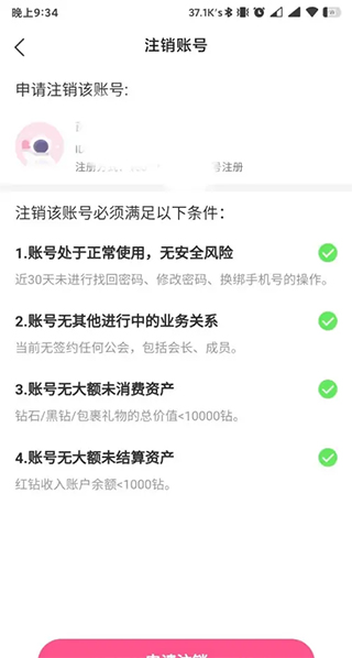 在界面中阅读账号注销的必须条件,确认无误后点击界面下方的申请注销按钮进入下个界面。