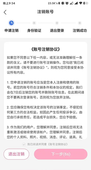 阅读账号注销协议,确认无误后勾选我已阅读并同意《账号注销协议》,然后点击下一步按钮,然后根据手机提示操作即可,大家可以根据自身需要选择设置。