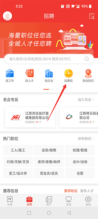 1、首先我们安装好app,进入主页面后会看到非常多的选项栏,小编给大家以兼职为例子给大家介绍。我们点击下方的招聘,然后进去后里面有个兼职,如图所示