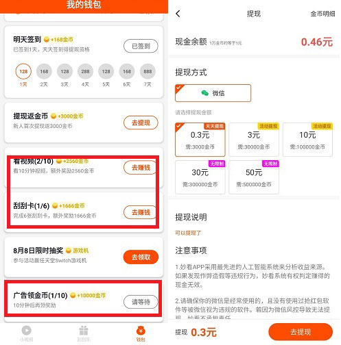 2、满0.3元就能提现,看视频、签到、走路、做任务都能赚金币,天天提现到微信红包