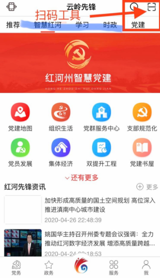 (二)打开“云岭先锋APP”。选择右上角扫码工具。