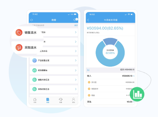 销售流水、购买流水、净利润、对账单等表格一键生成,业务数据沉积清晰,店铺经营状况一目了然。