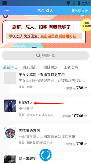 扣字怼人输入法免费版是一款专门为怼人而制作的多功能怼人软件。无论你想怼人发泄情绪,还是想给朋友开个玩笑,这款应用都能帮助你快速、轻松地表达自己的不满或幽默。扣字怼人输入法APP拥有丰富的怼人功能。它提供了大量的怼人词库和句式,无论是尖锐的讽刺,还是幽默的调侃,应用内都可以找到合适的怼人语句。你可以根据不同场景和对象,选择合适的词句来怼人,让对方感受到你的锐利和幽默。无论是社交软件还是聊天工具,你都可以随时怼人,让你的怼人技能得到充分发挥。