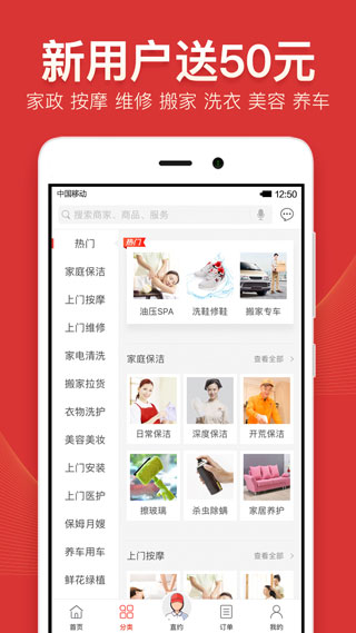 1、上门服务大品牌;2、支持家政、按摩、维修、搬家等服务;
