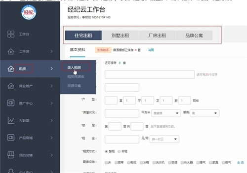 2、点击租房-录入租房,可录入住宅、别墅、厂房和品牌公寓的出租房源。