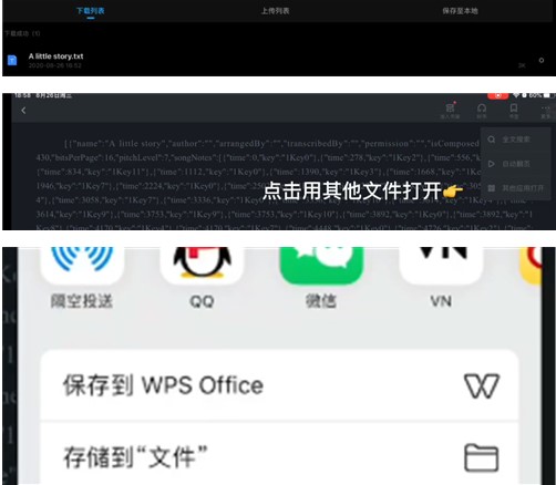 2、将下载好的曲谱文件点击中间呼出菜单,点击右上角的“更多”按钮,选择“用其他文件打开”一项,将其存储到刚刚创建好的文件夹中。